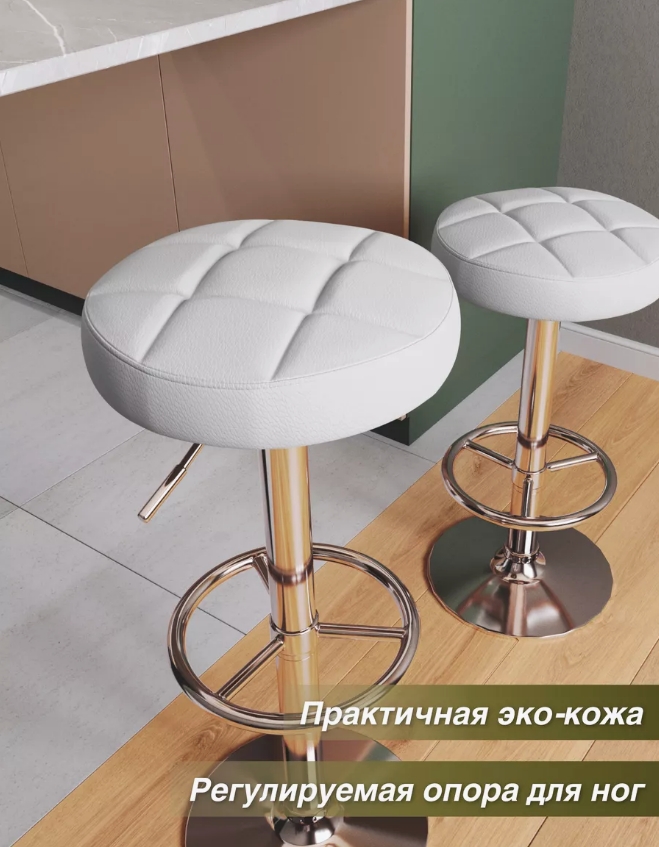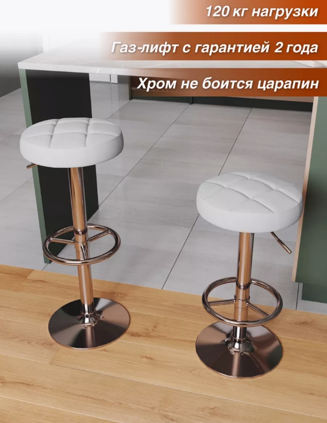Чем замечателен круглый барный стул? На него можно садиться с любой стороны, в любом положении! Ведь бывают в жизни моменты, когда ценишь и каждое мгновение, и отсутствие лишних движений, чтобы забраться на стул около барной стойки. Барный стул BC-006 выполнен на хромированной ноге-основании с регулировкой высота сиденья. Высота от пола до сиденья может регулироваться от 61 до 83 сантиметров (указано расстояние от верха сиденья до пола). Таким образом, стул подходит для барной стойки высотой от 85 до 115 сантиметров. Примечательно, что опора для ног поднимается вместе с сиденьем. Что делает его удобным на любой высоте. В отличии от любой краски (черной, белой или серой) выполненное хромирование дополнительно защищает ножку от царапин и повреждений. Пышное мягкое сиденье обито экокожей, подходит для влажной и сухой чистки, не боится загрязнений.