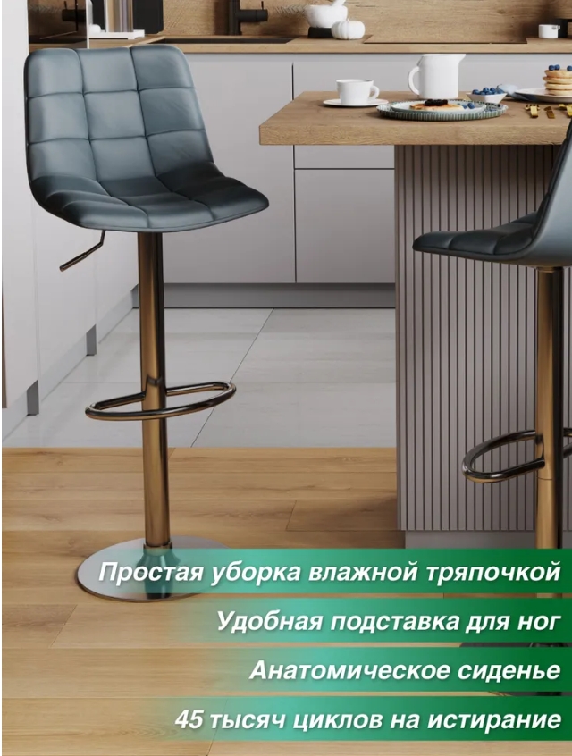 Барный стул оснащен подъемно-поворотным механизмом типа газлифт. Благодаря этому, стул подойдет к любой барной стойке и будет удобен любому — ведь высоту сиденья легко отрегулировать. Барный стул вращается на 360 градусов. Хромированная опора не боится царапин и придаёт стулу изысканный стиль. Основание снабжено нескользящей резиновой накладкой, что делает передвижения стула бесшумными и не оставляет следов на половом покрытии. Стул имеет удобную опору для ног.